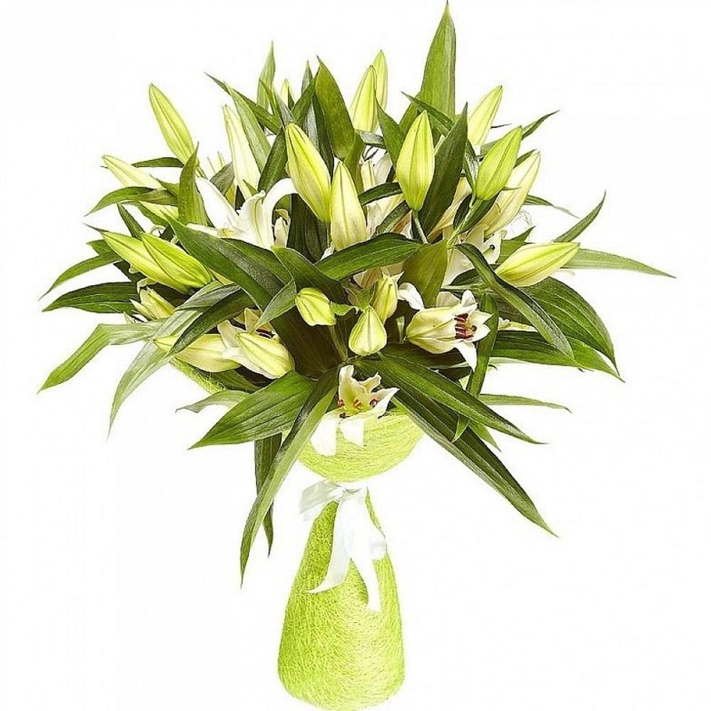 Букет состоит из 9 веток белых лилий, зелень, красивая упаковка, атласная лента.