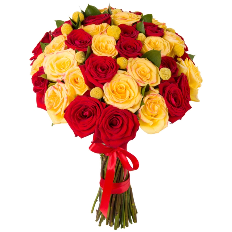 Букет состоит из 23 красные розы, 22 желтые розы, 11 желтая краспедия, прозрачная упаковка, атласная лента.